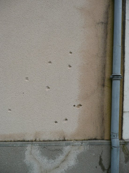Septembre 2024. Traces de balles sur le mur de Monnerville où le babouin a été abattu en 1995.