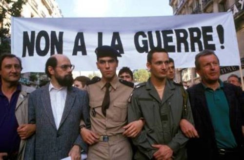 Samedi 20 octobre 1990. C’est une réussite qui surprend même les organisateurs : 30.000 manifestants. Plusieurs rassemblements en province. En tête du cortège parisien, deux soldats du contingent en uniforme, Frédéric Poncet et Pascal Bidaux, défilent symboliquement sous la banderole "Non à la guerre", deux appelés au service militaire qui affirment "Cette guerre, nous n’irons pas la faire !" (Ils seront par la suite punis de vingt jours d’arrêt.)